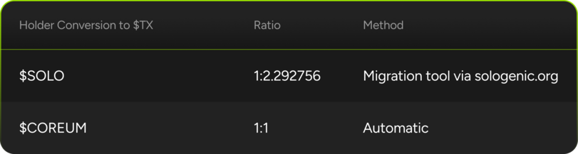 The core team strongly encourages all existing Coreum and Solo holders to move forward with TX, benefiting from its concentrated value, liquidity, and institutional adoption. TX is the logical, economic, and strategic evolution of what the community has already built. This proposal does not dilute that vision. It completes it.